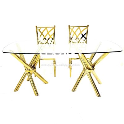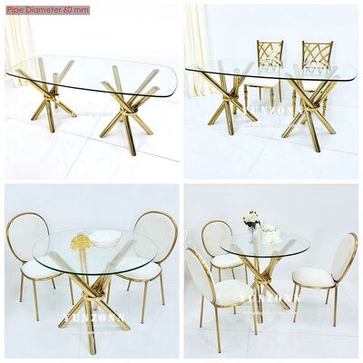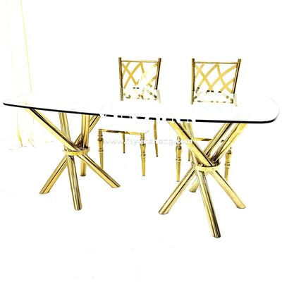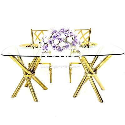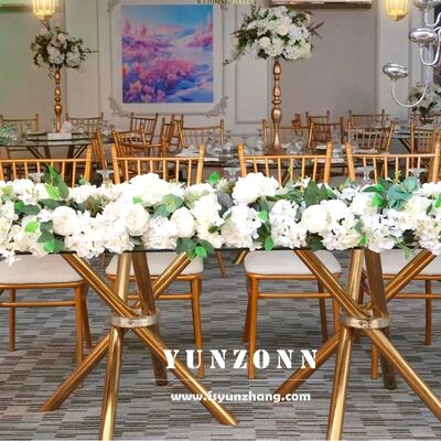 | 제품명: | 가볍고 안정적인 저렴한 골드 스테인리스 스틸 크로스 레그 투명 유리 이벤트 웨딩 연회 테이블 |