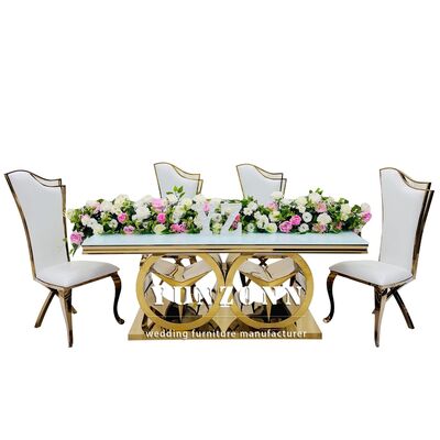| 제품 이름: | 벤츠 기반의 현대 금 직사각형 식탁 럭셔리 웨딩 이벤트 가구 야외 및 호텔용 유리 / MDF 탑 |